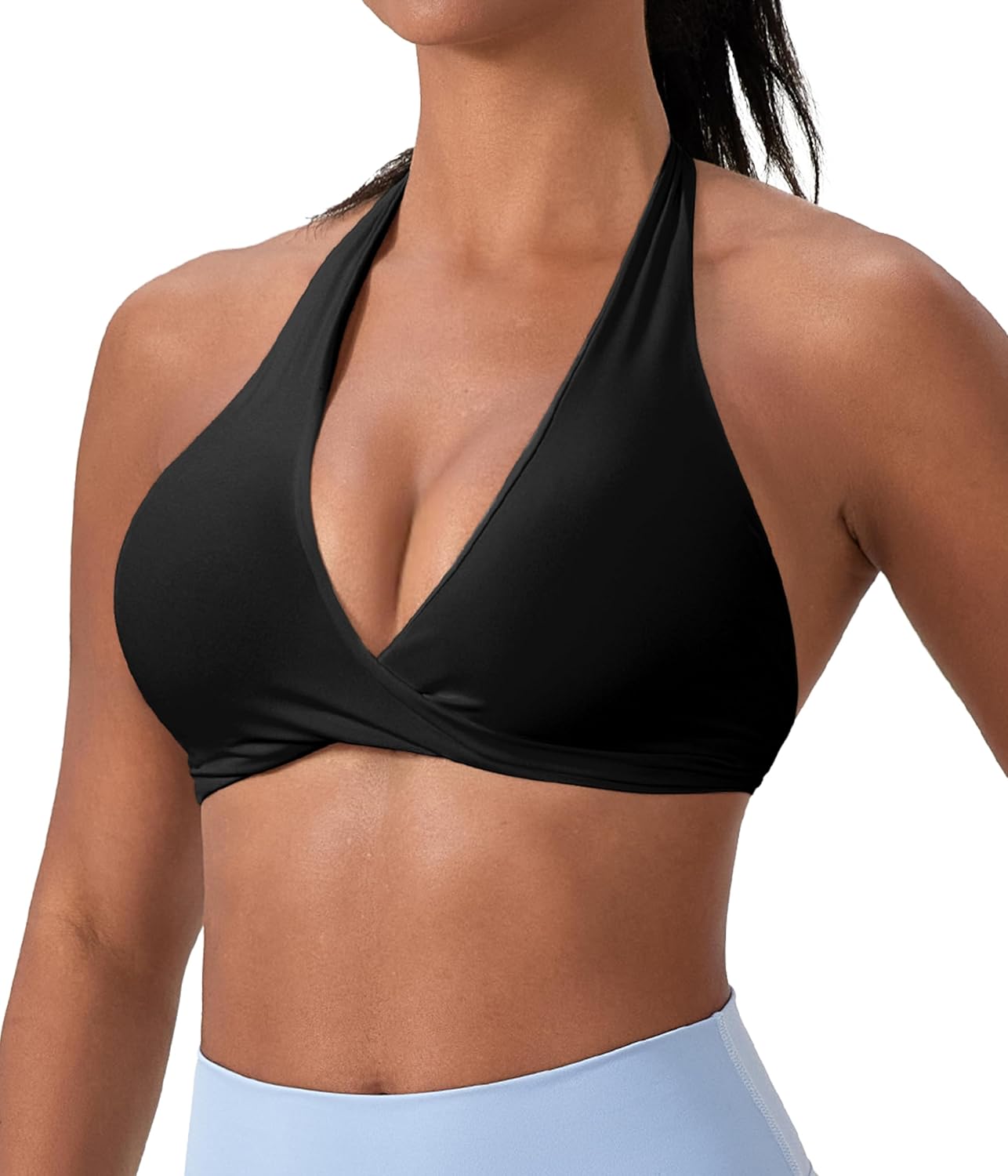 Halter Sports Bras for Women Padded Yoga Bra Low Impact Gym Workout Bra Tops Open Back Front V-Neck Everyday Bra